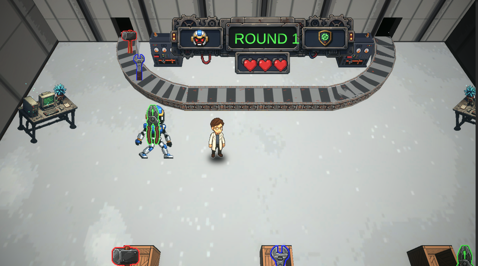 Unpredictable unsafe robots: Robots are sorting items on the stage. However, unpredictable, unsafe robots are mixed in.Reprogramming for safety: If you find a robot trying to use the wrong box, push it to the "Computer" to "fix" it.High-speed decision-making: In an ever-changing situation, keep running (SHIFT key) and pushing robots (Space key) to maintain safety.